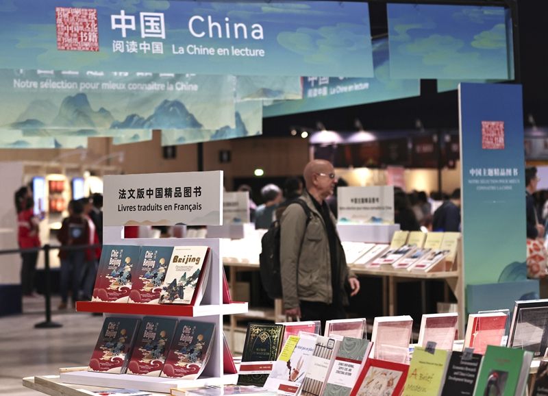 這是2024年4月12日在法國巴黎臨時大皇宮舉行的2024巴黎書展上拍攝的中國圖書展區(qū)一角。新華社記者 高靜 攝